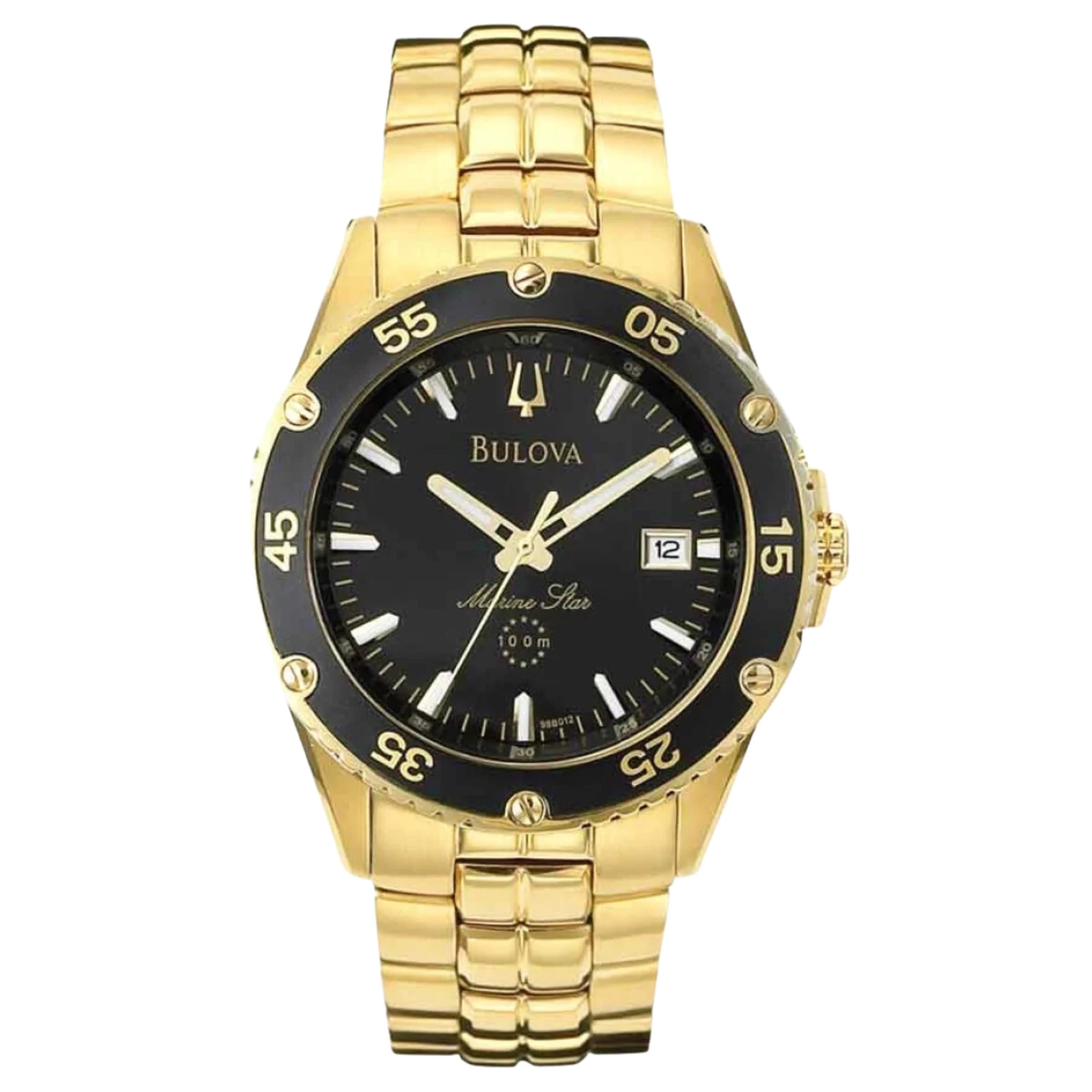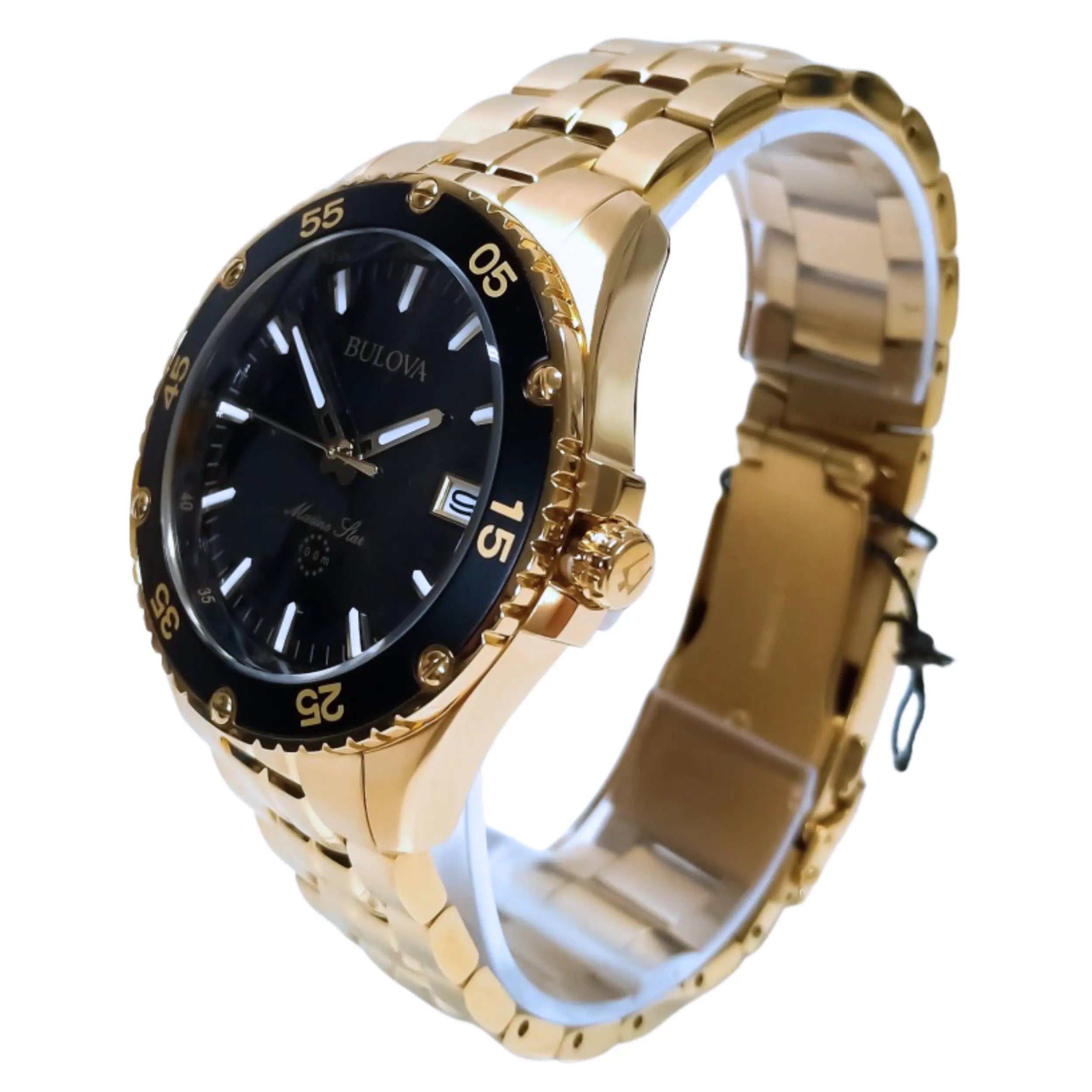 Relógio Bulova WB30757U com Caixa Redonda e Pulseira em Aço na Cor Dourada e Mostrador em Preto.