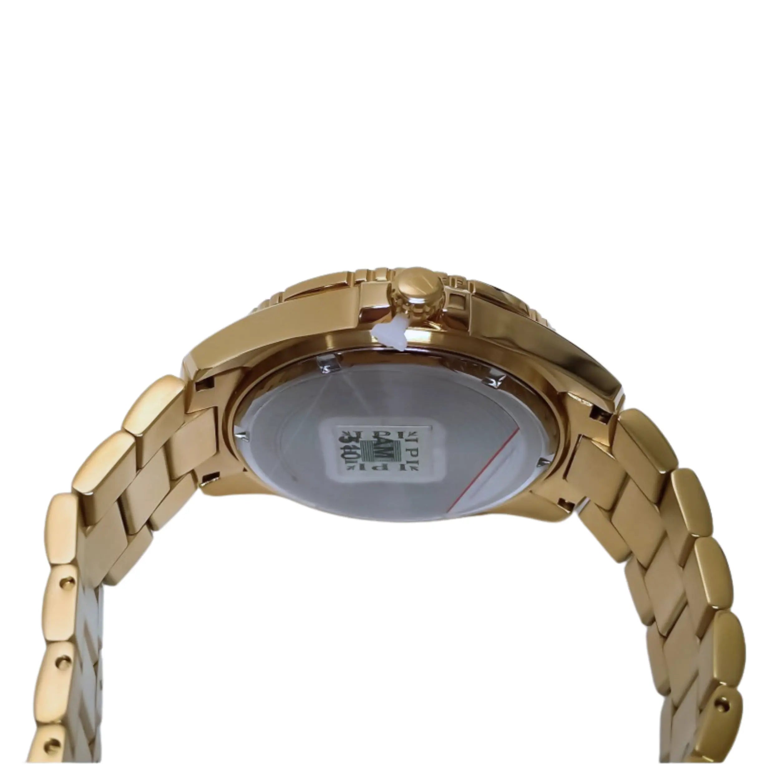 Mostrador: Mostrador analógico na cor preta com detalhes em dourado e calendário