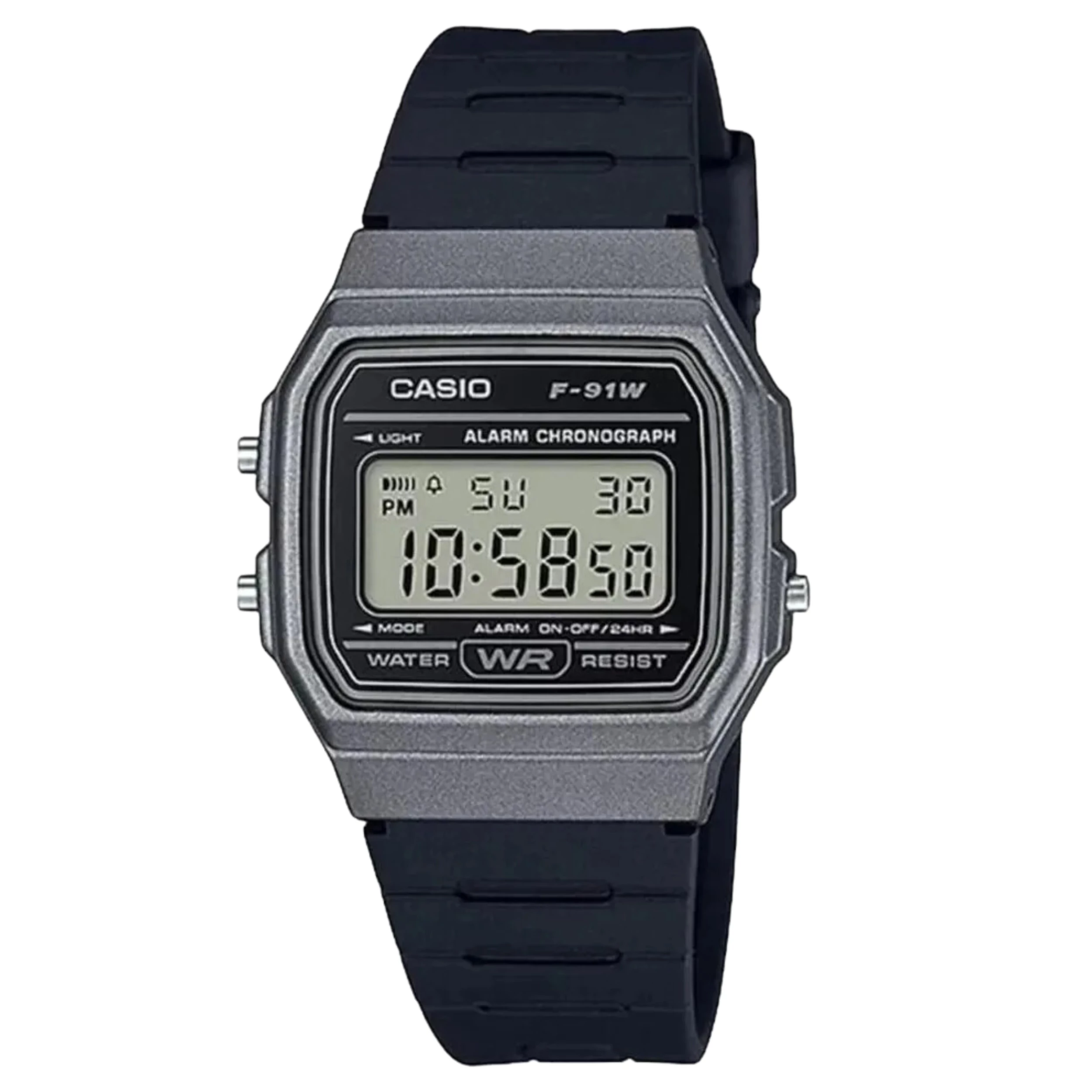 Relógio Casio F-91WM-1BDF-SC com Caixa Quadrada e Pulseira em Resina na Cor Preta e Mostrador Digital.