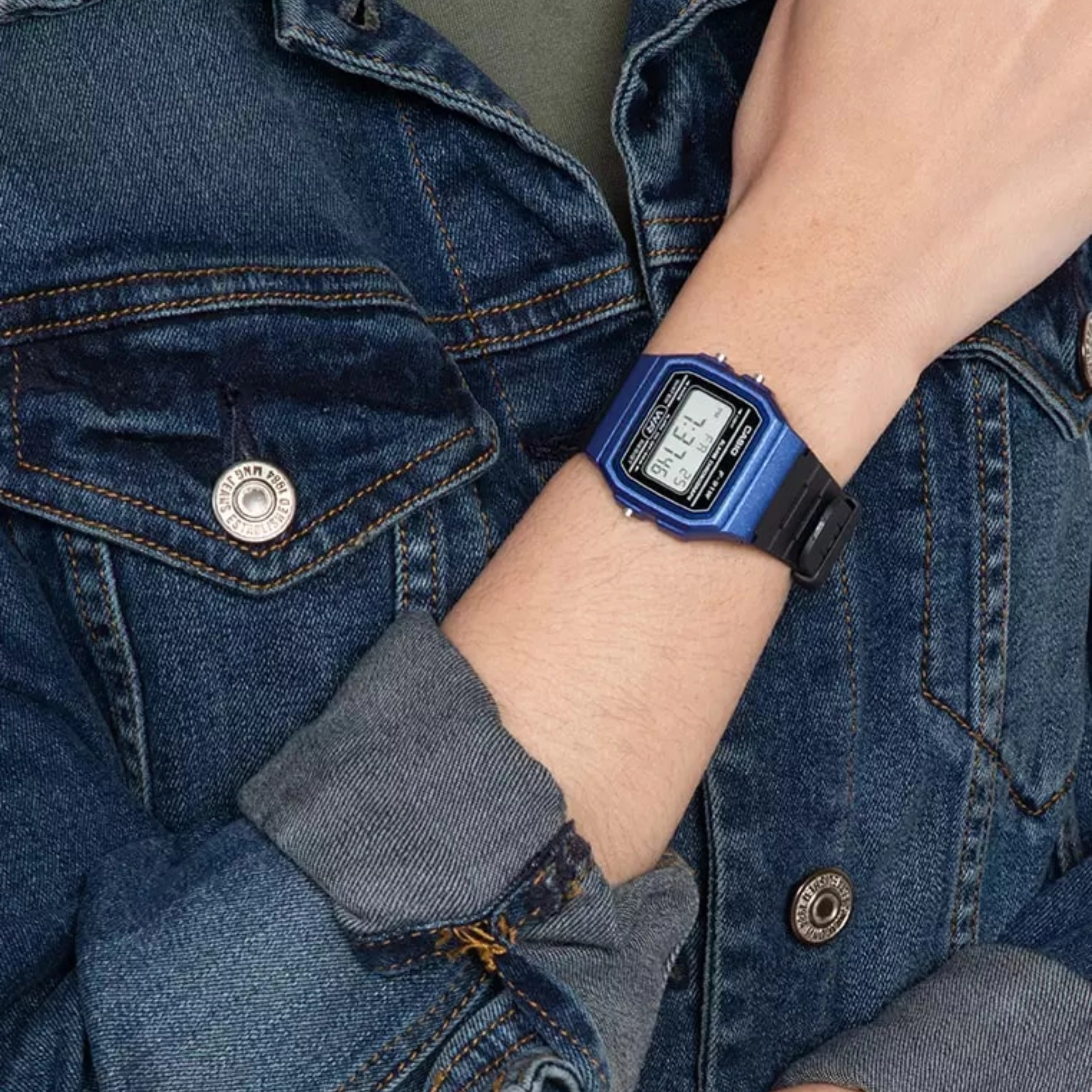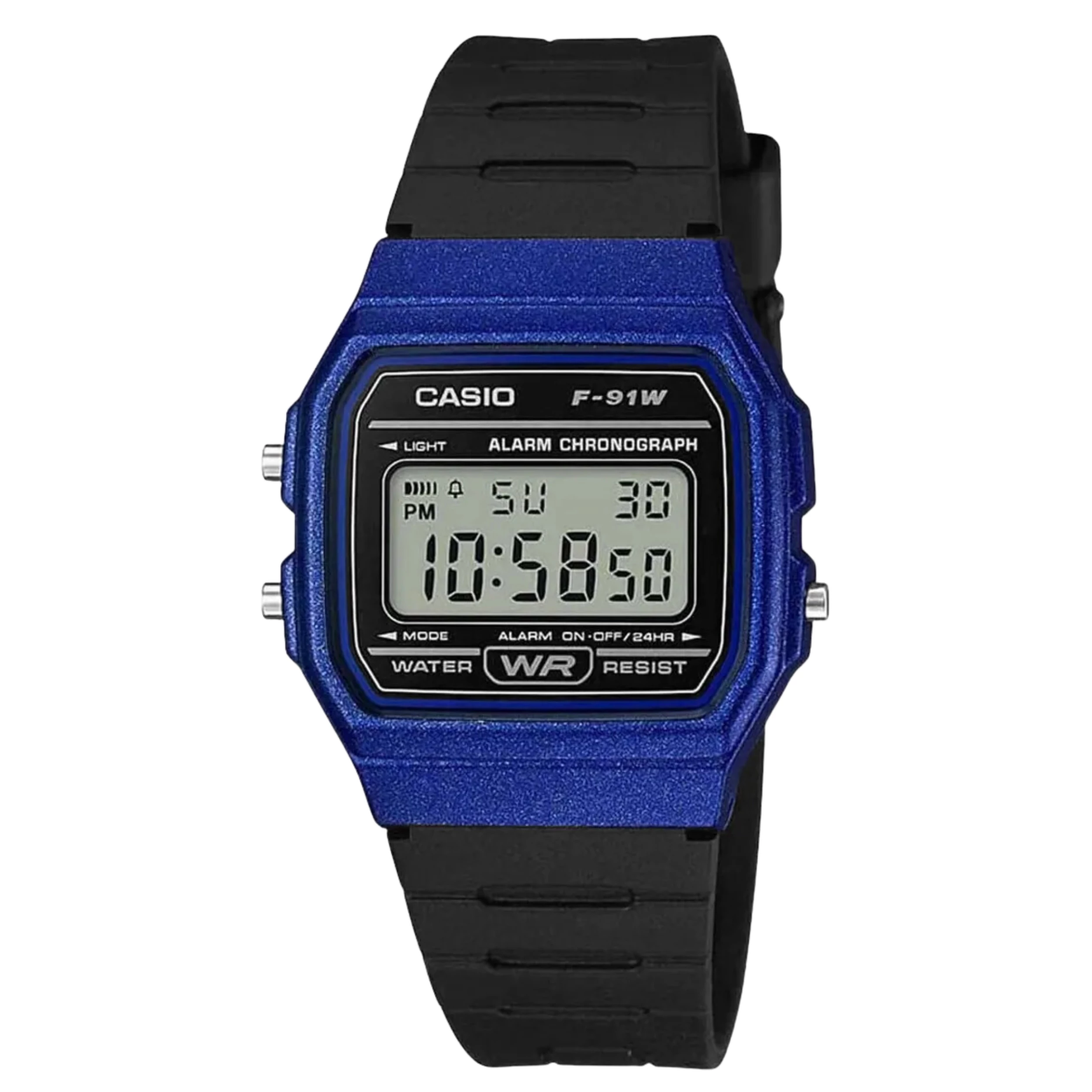 Relógio Casio F-91WM-2ADF-SC com Caixa Quadrada e Pulseira em Resina na Cor Preta e Mostrador Digital.