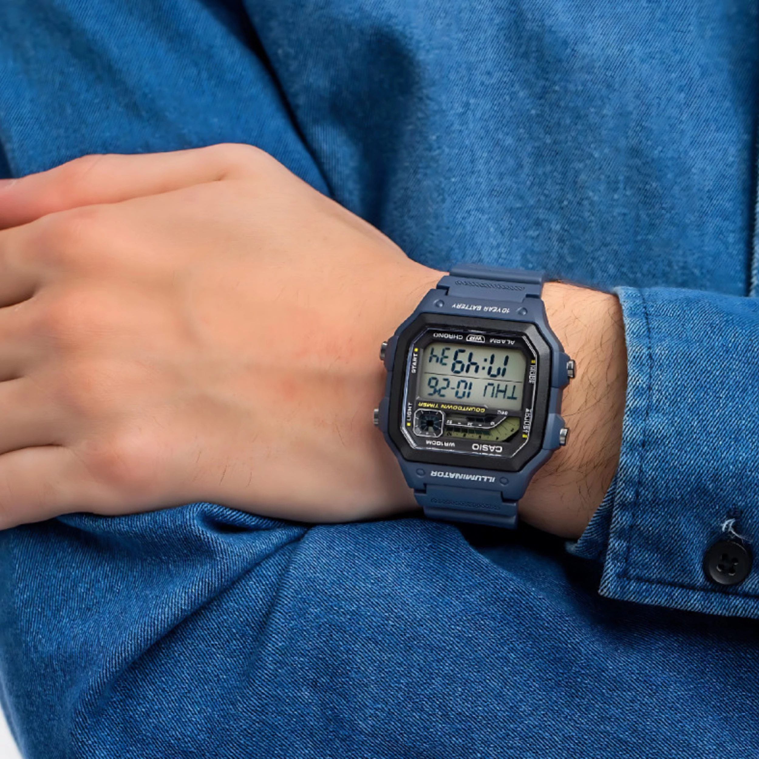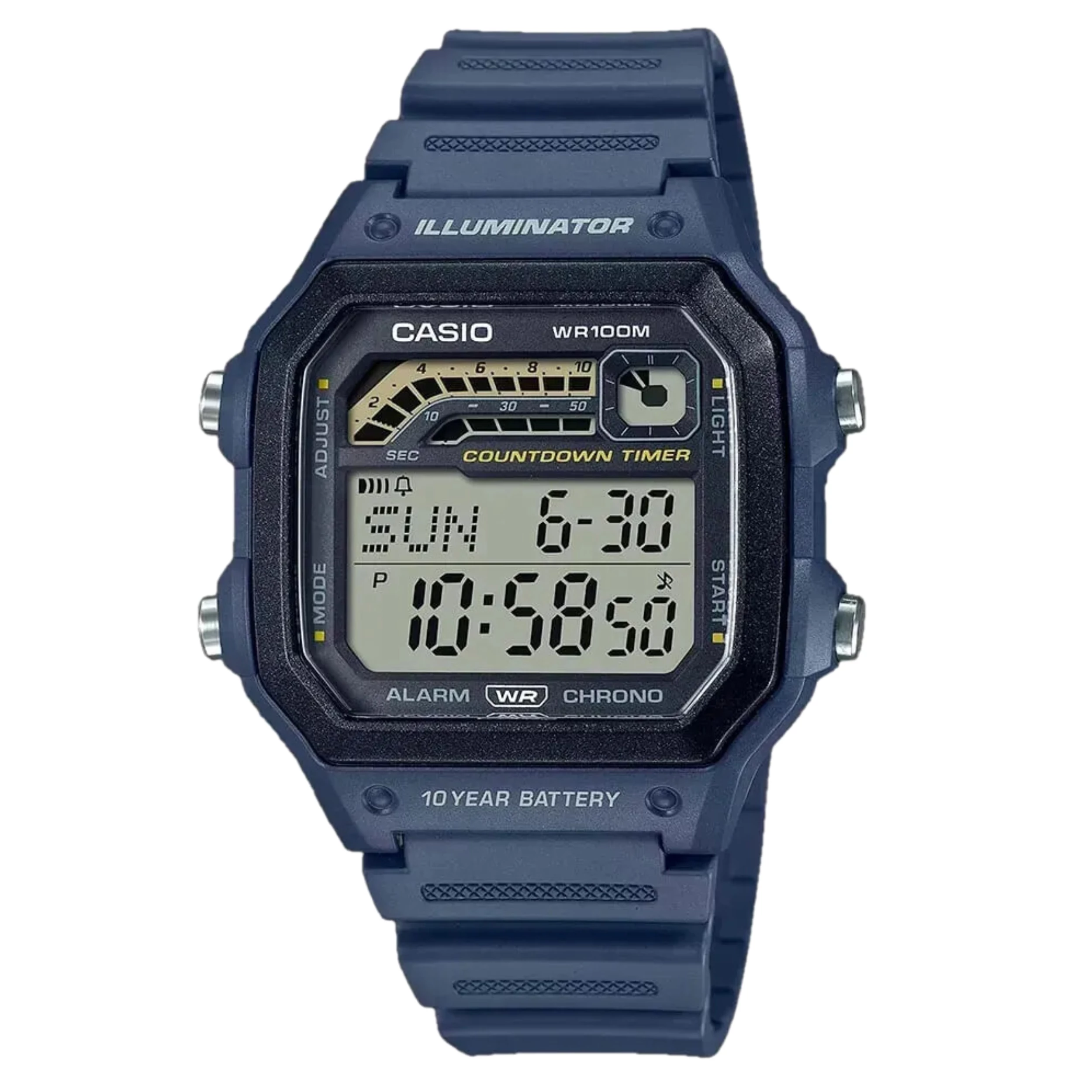 Relógio Casio WS-1600H-2AVDF-SCcom Caixa Quadrada e Pulseira em Resina na Cor Azul e Mostrador Digital.