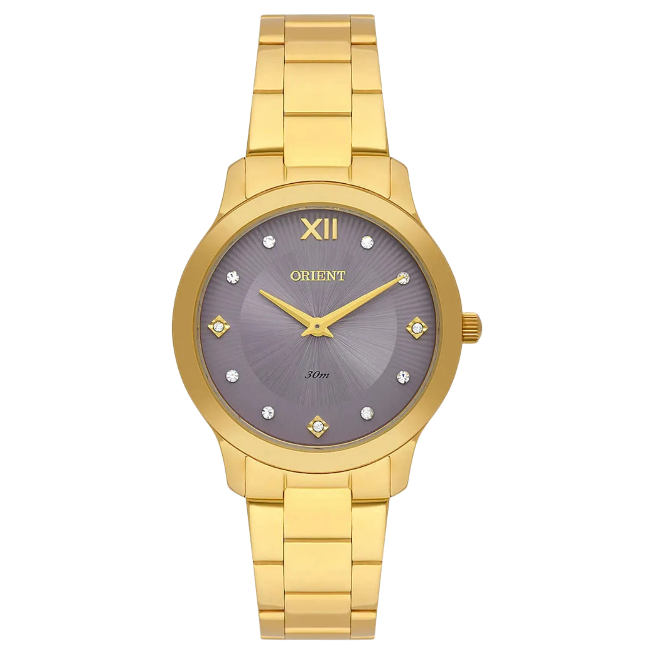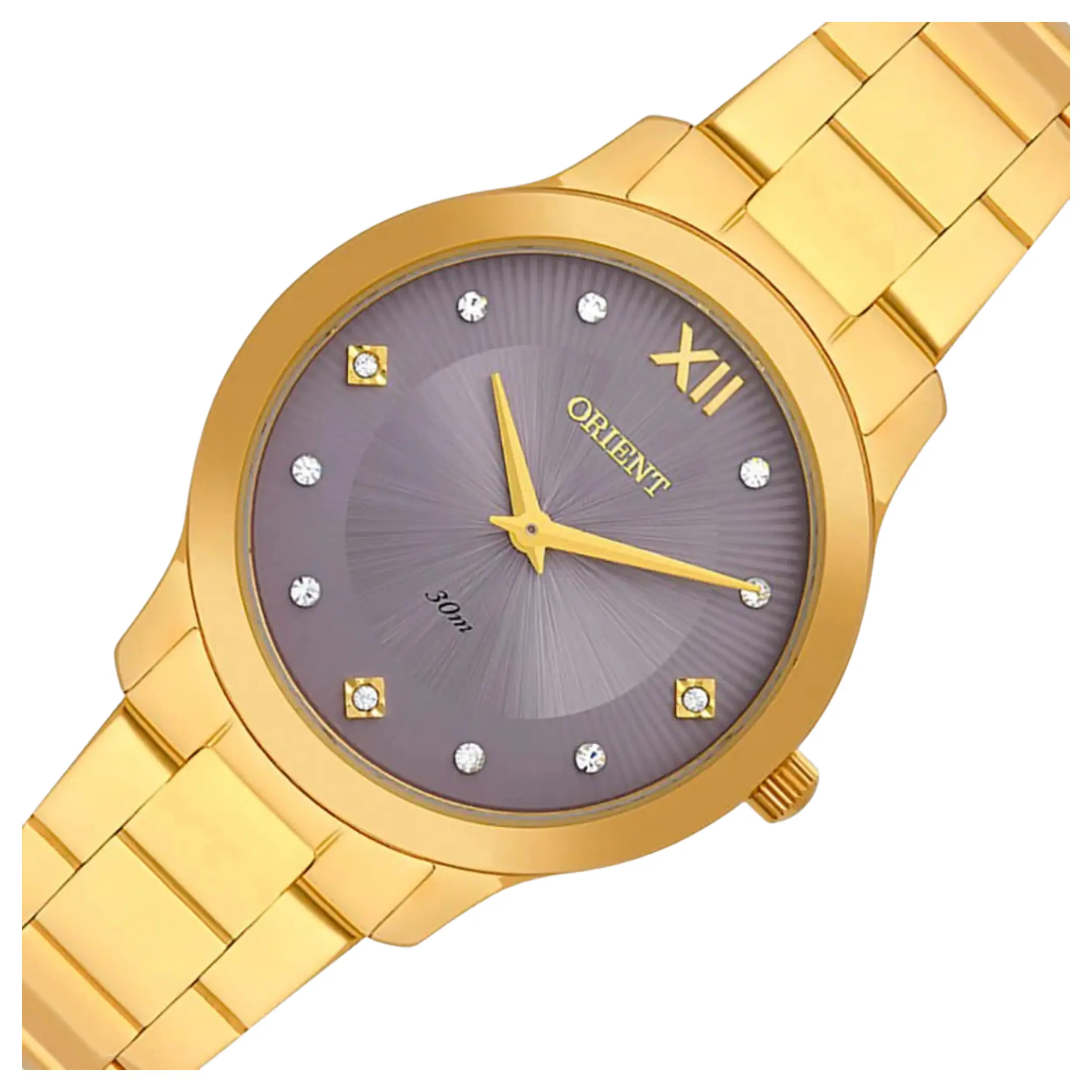 Relógio Orient FGSS0225 L3KX com Caixa Redonda e Pulseira em Aço na Cor Dourada e Mostrador Roxo.
