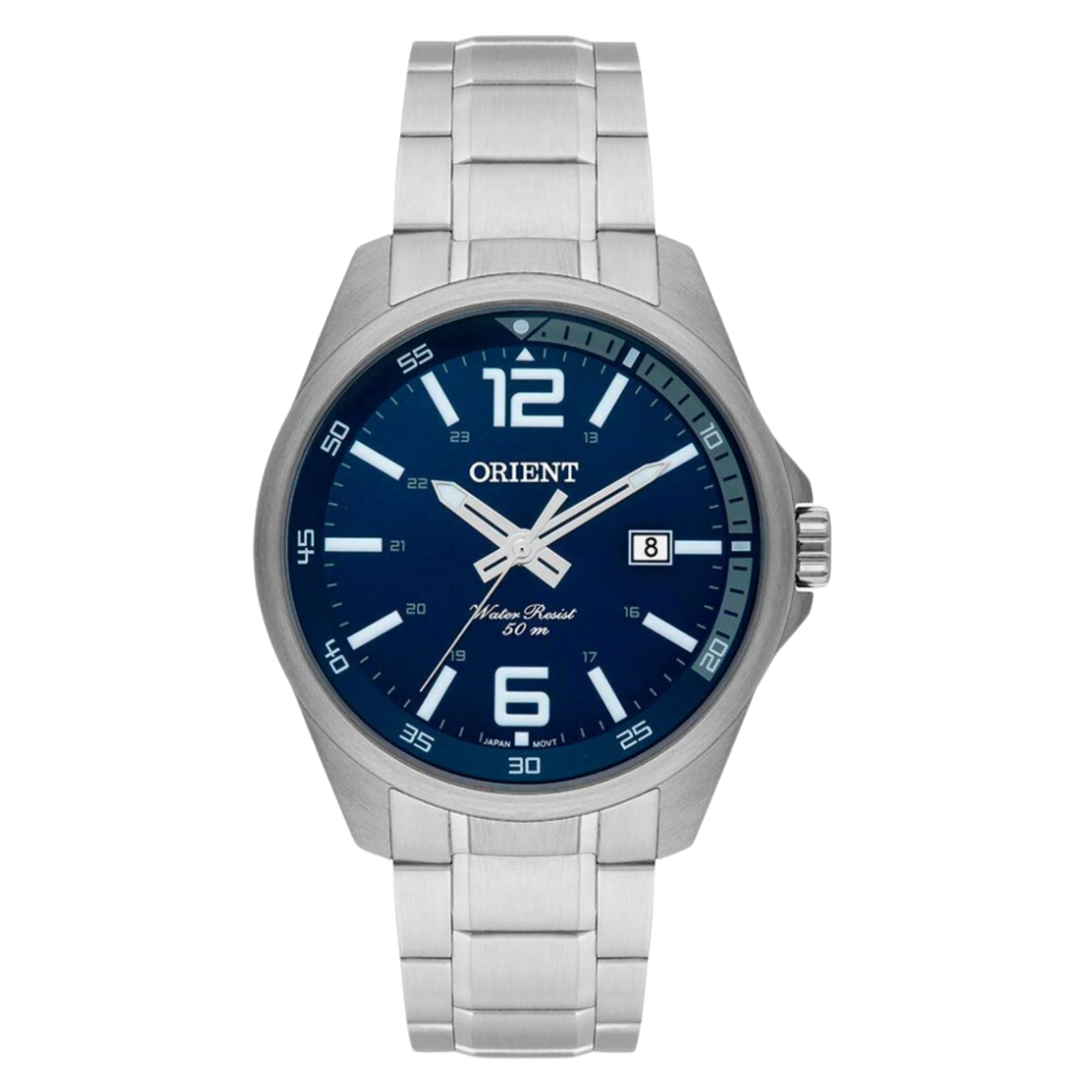 Relógio Orient MBSS1275 D2SX com Caixa Redonda e Pulseira em Metal na Cor Prata e Mostrador em Azul.