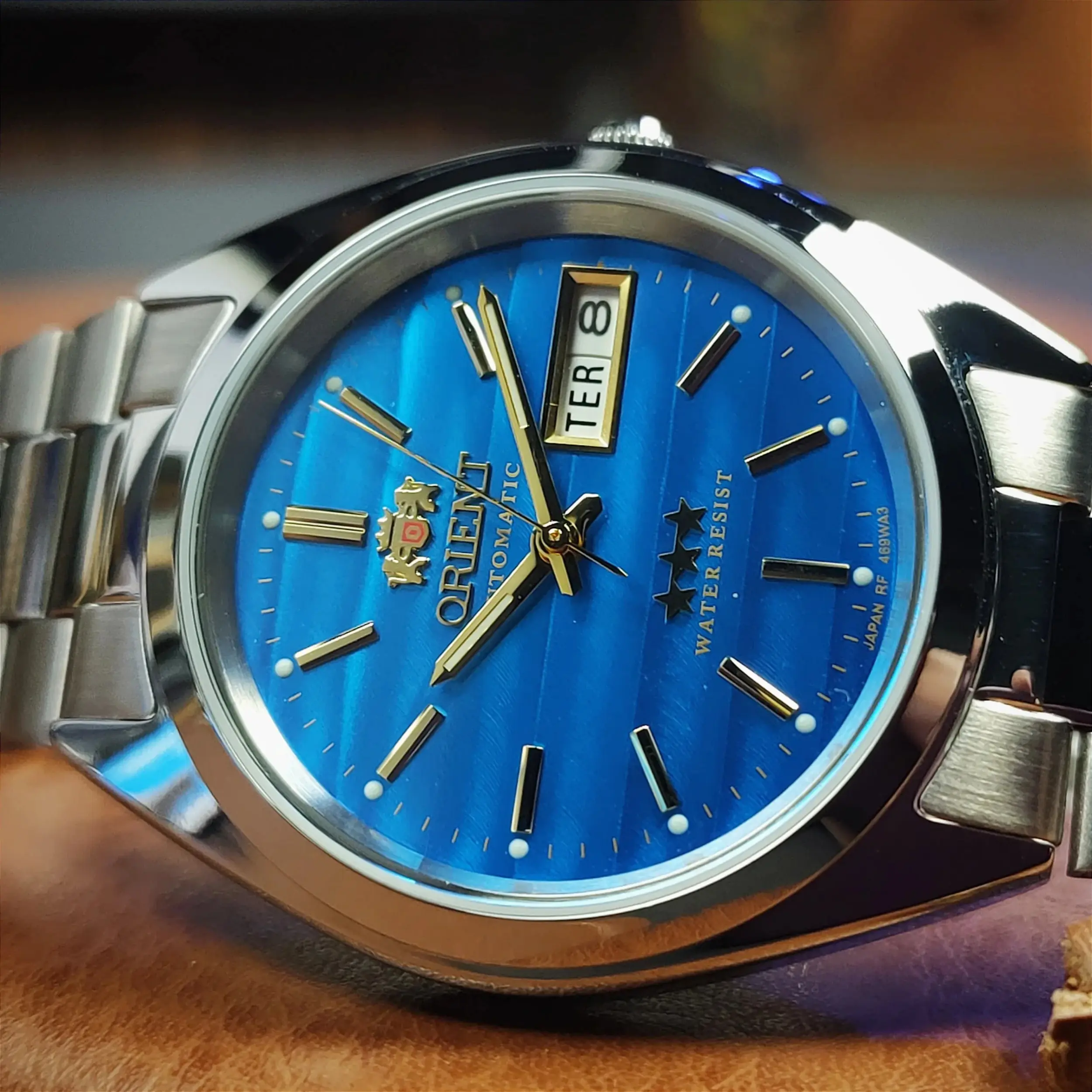 Relógio Orient 469WA3F A1SX com Caixa Redonda e Pulseira em Aço na Cor Prata e Mostrador em Azul.